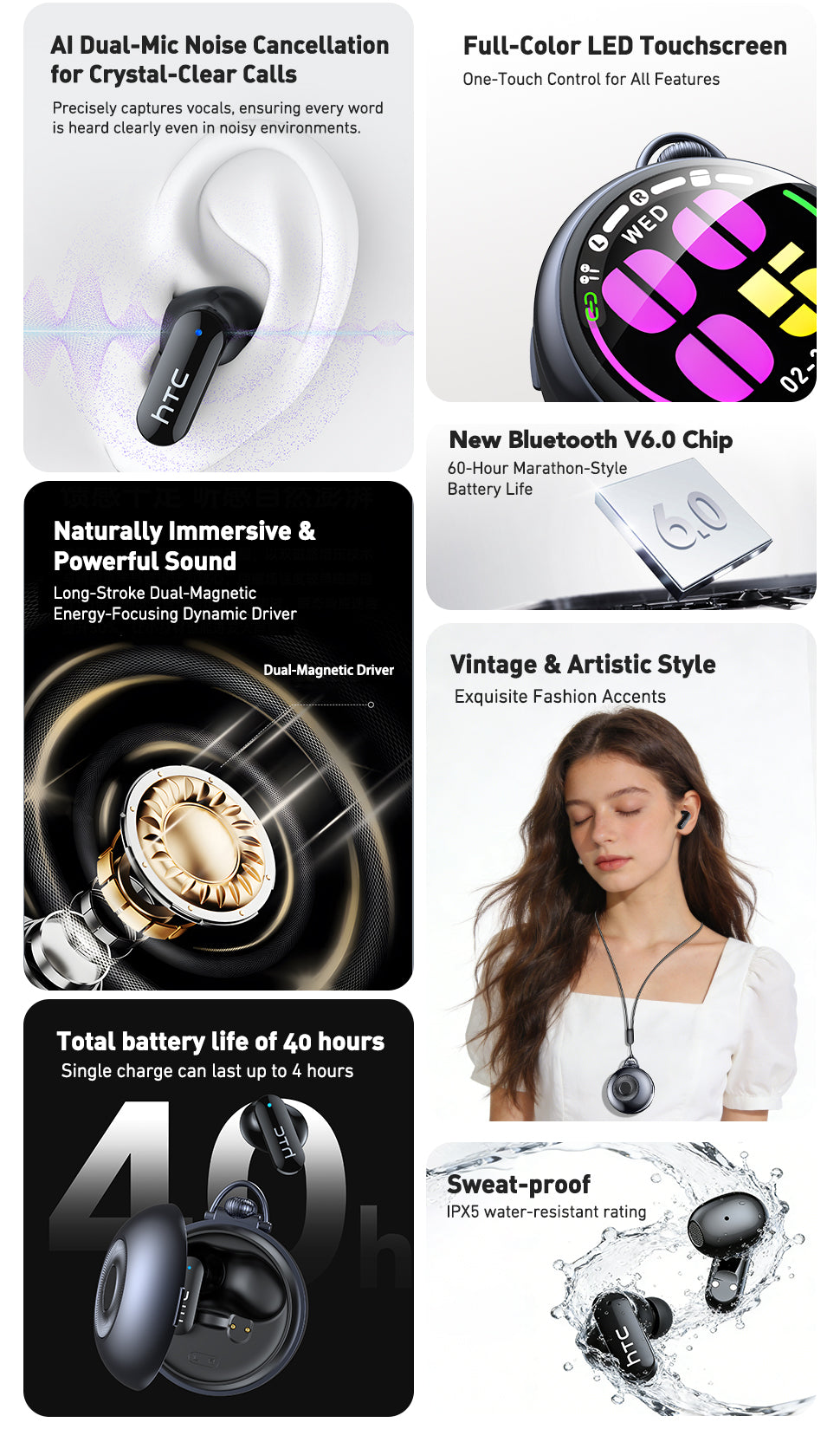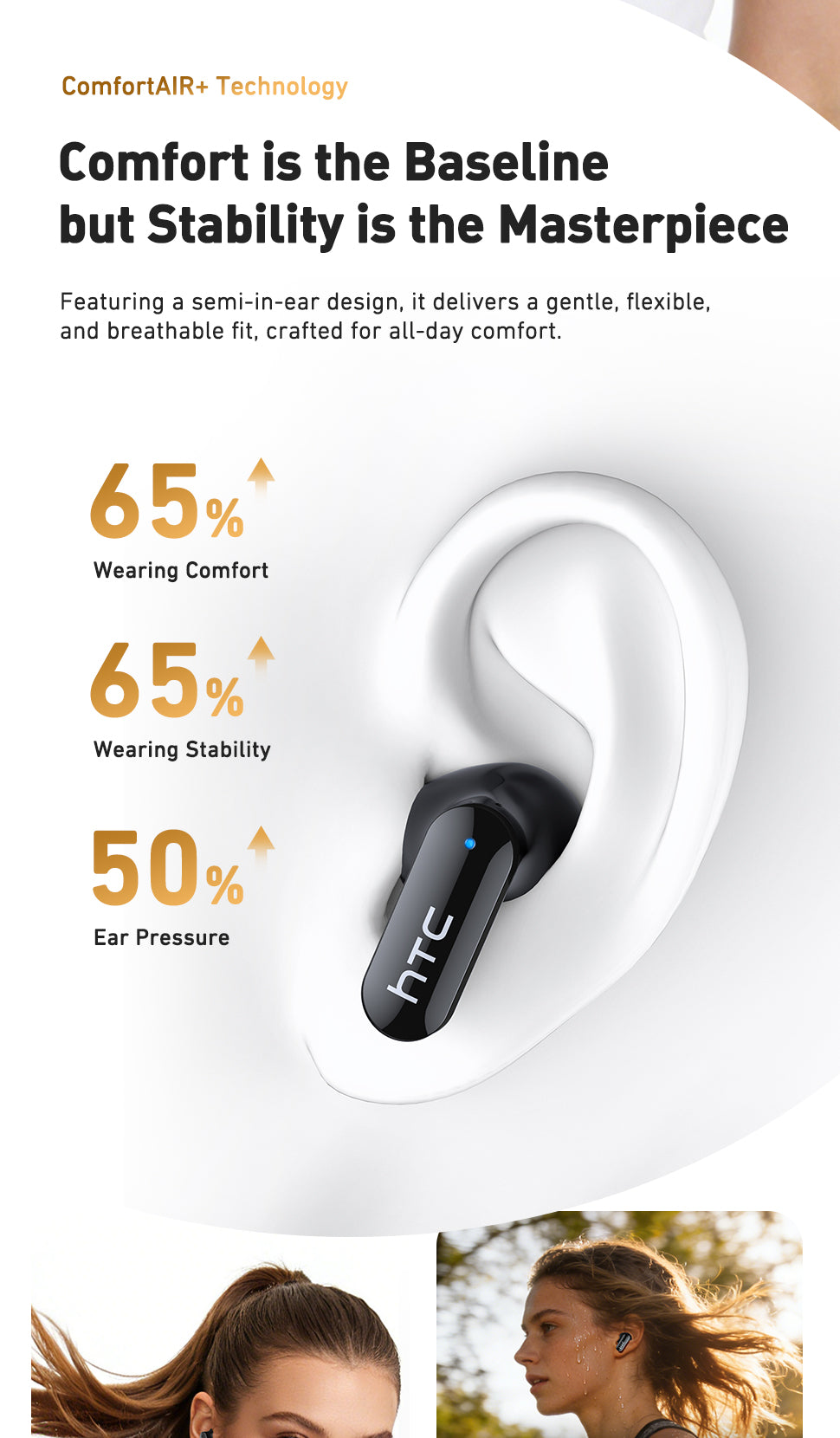- HTC NE71 Wireless Earphones redefine open-ear listening with a futuristic design, combining a lightweight, secure fit with all-day comfort while keeping you aware of your surroundings for safer movement indoors and outdoors