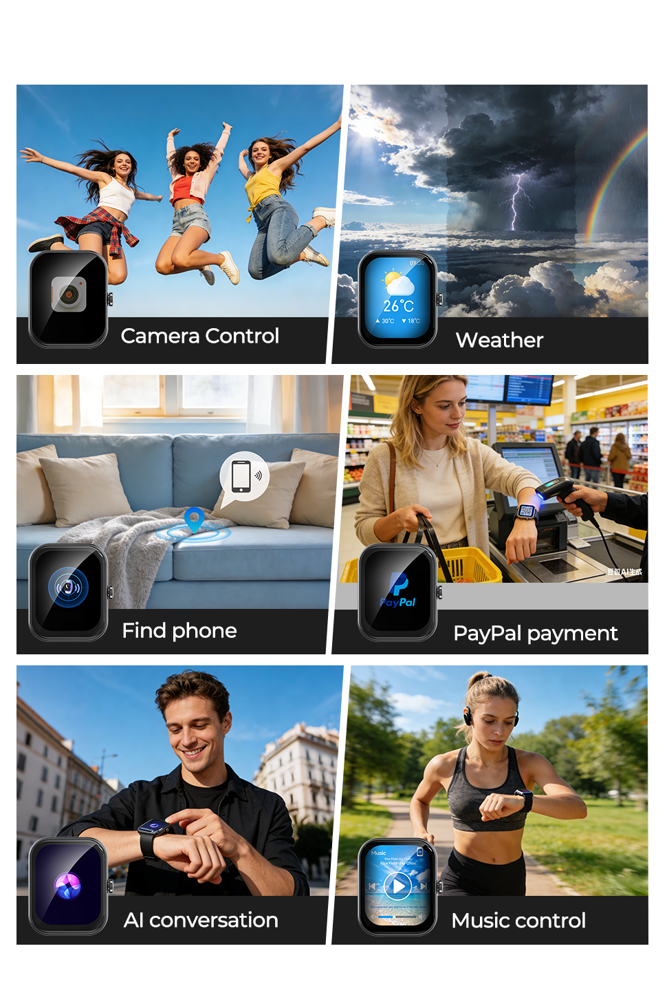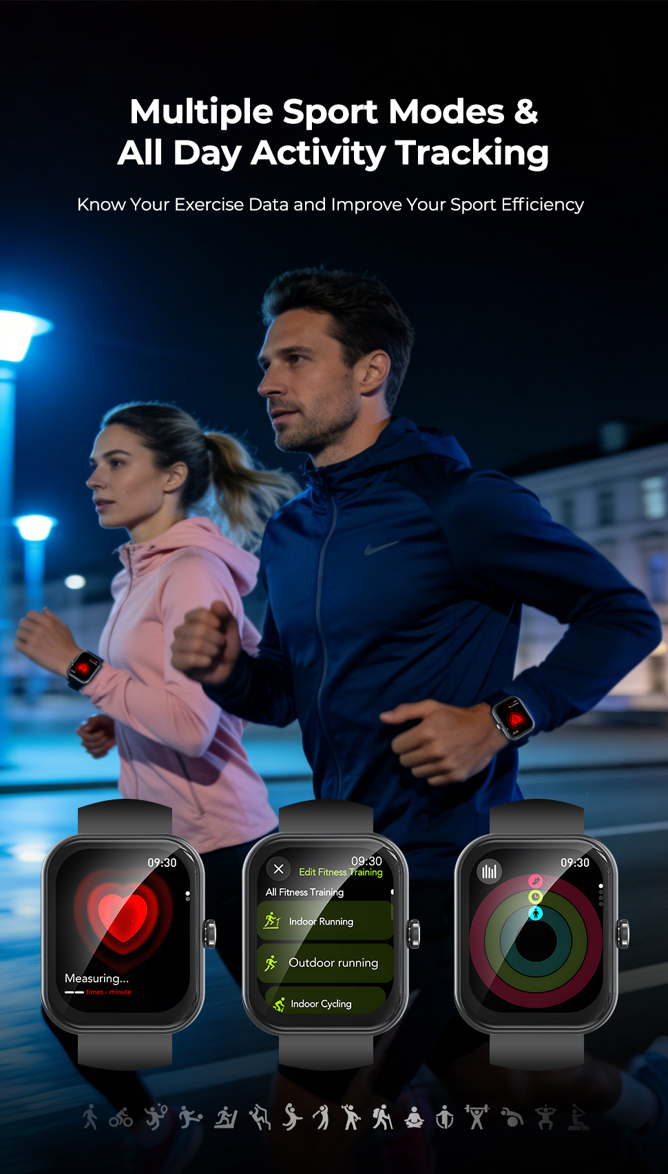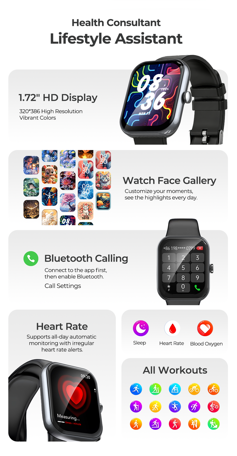 - With multiple sport modes and intelligent activity tracking, this smart watch accurately records workouts such as running, walking, cycling, and other training sessions, making it a reliable fitness companion for performance improvement and daily exercise management.