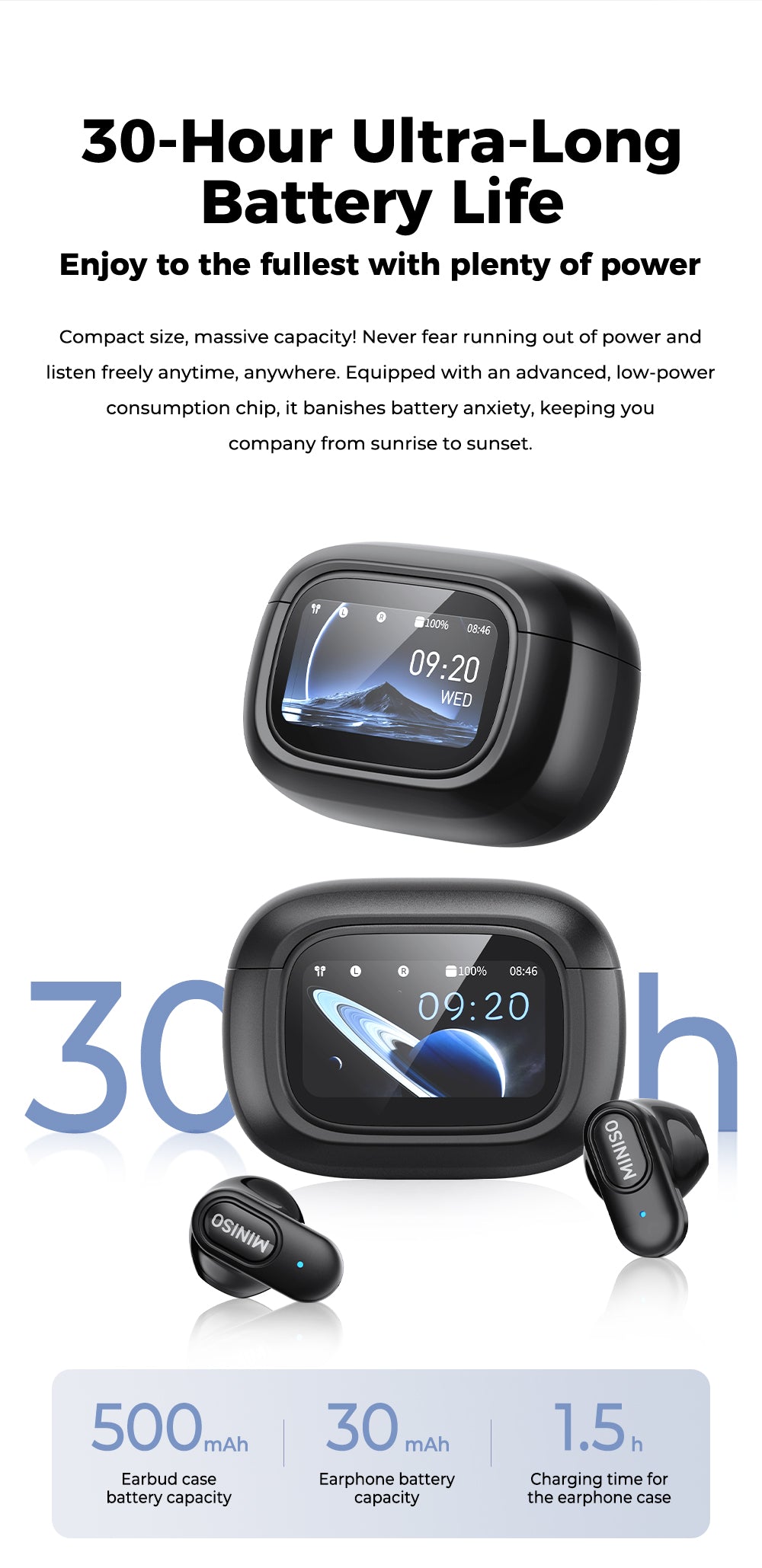 - 30-Hour Battery Life. With a 500mAh charging case and energy-efficient earbuds, you get up to 30 hours of playback. A full charge takes just 1.5 hours—so your music never skips a beat. The sleek, matte-finish case adds a modern, premium touch.