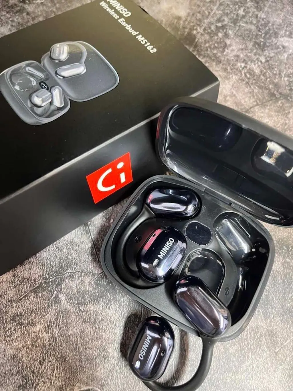 MINISO MS162 wireless earbuds with Bluetooth 5.4, HIFI sound, IPX5 waterproofing, low-latency gaming, touch controls, ergonomic open-ear comfort, 50-hour battery, AI real-time translation in 135 languages via EarJoy APP, and built-in smart tracker for easy locating.